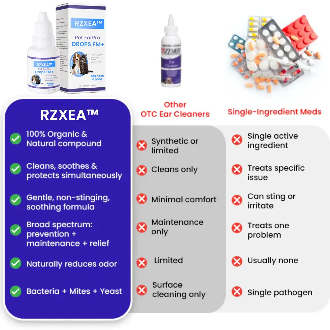 RZXEA™ Pet EarPro Drops FM+ uses the same veterinary prescription formula clinics rely on: dual-action antimicrobial compound that relieves symptoms in 3-5 days and completely eliminates infection in 7-14 days.